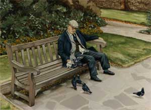 http://www.margaretturtonart.co.uk Fred wanted to be alone with his thoughts while he feed the pigeons. He wished the kids playing close by would just go away. Every time they screamed and laughed, Fred jumped, which startled the pigeons. They would fly beyond the reach of where he tossed seeds. Finally, the children moved on to another part of the park. Fred sat on the bench waiting for the moment when the birds grew comfortable with his presence.